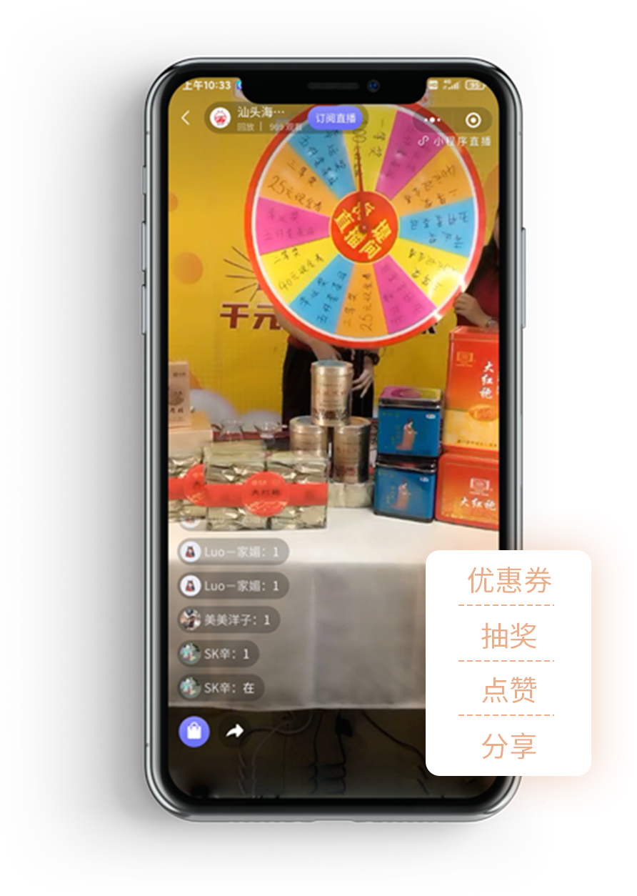 集中多种功能,商品下单、转发 分享、点赞,搭建自己的专属直播间